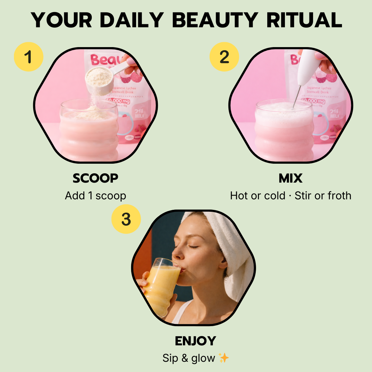 Add one scoop of Beauty Milk / Beauty Bean to your favorite cup.